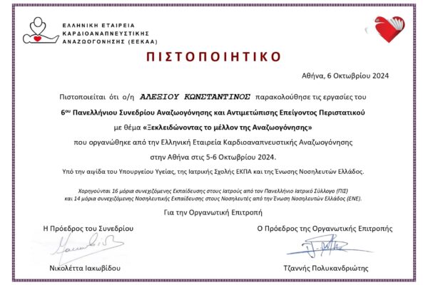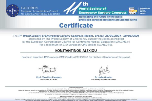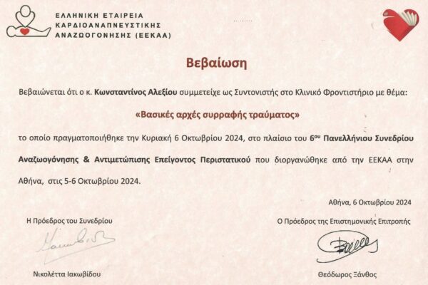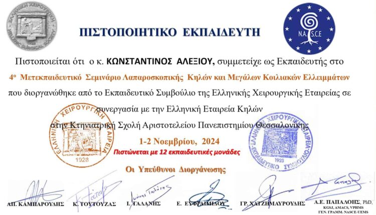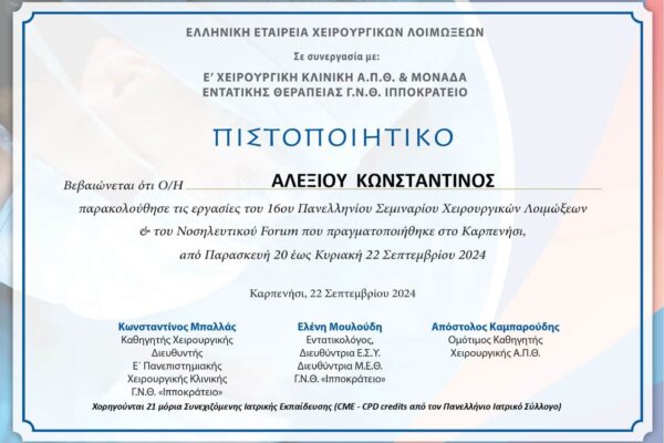 Με την 1395/12-7-2006 γνωμοδότηση του Κεντρικού Συμβουλίου Υγείας και με την 4414/24-7- 2006 απόφαση του Νομάρχη Ανατολικής Αττικής του χορηγήθηκε η ειδικότητα του Γενικού Χειρουργού.
