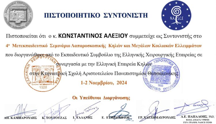 Ο Γενικός Χειρουργός Δρ. Κωνσταντίνος Αλεξίου γεννήθηκε και μεγάλωσε στην Αθήνα. Εισήχθη στην Ιατρική Σχολή του Εθνικού και Καποδιστριακού Πανεπιστημίου Αθηνών όπου αποφοίτησε στις 20 Ιανουαρίου του 1995 και έλαβε την άδεια ασκήσεως επαγγέλματος στις 21 Μαρτίου 1995 με την υπ’ αριθμόν 10515/95 απόφαση της Νομαρχίας Ανατολικής Αττικής – Διεύθυνση Υγιεινής.